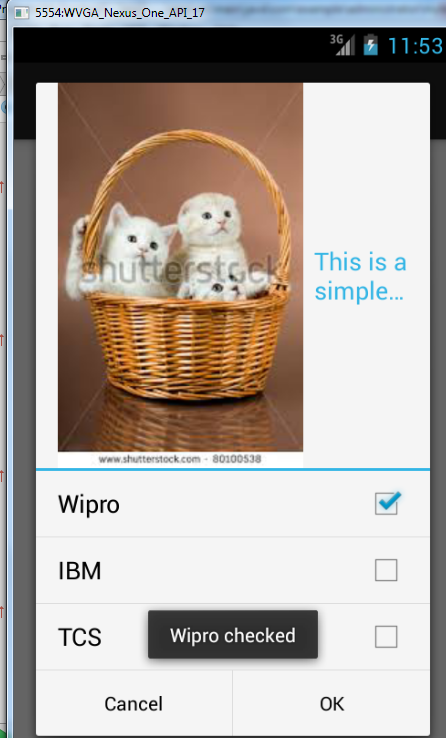 In the above code, OK and Cancel are sets using the setPositionButton() and setNegativeButton(). A user has the option to select multiple options by using setMultipleChioceItems() method. When an option is checked or unchecked by the user, he/she gets the message that selected option is checked or unchecked.