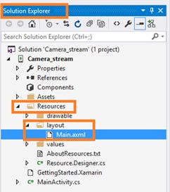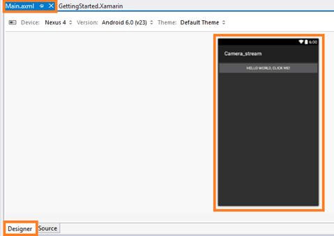 Next go to the solution explorer. In the solution explorer you have the all files and sources in your project. Next Select Resource-->Layout-->double click to open main.axml page. You want select source to write the xaml code. If you want to design it, choose the designer window so you can design your app.