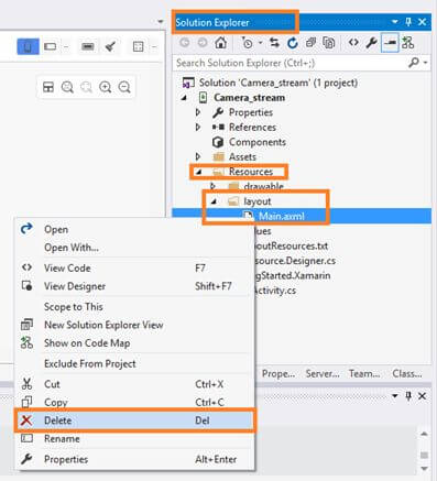 Now, Go to Solution Explorer-->Resource-->Layout-->Main.axml-->Right click-->Delete.
