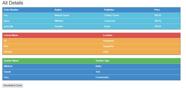 Here, I have used 3 tables with no relationship among them. Here, I'm downloading the first table in sheet1 and the first and second table are downloading sheet 2. I will use MVC with SQL Server.