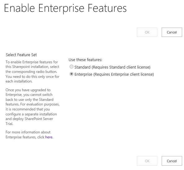 This configuration will help the admins to configure the ability to choose standard or enterprise features as farm license in the Central Admin Server.