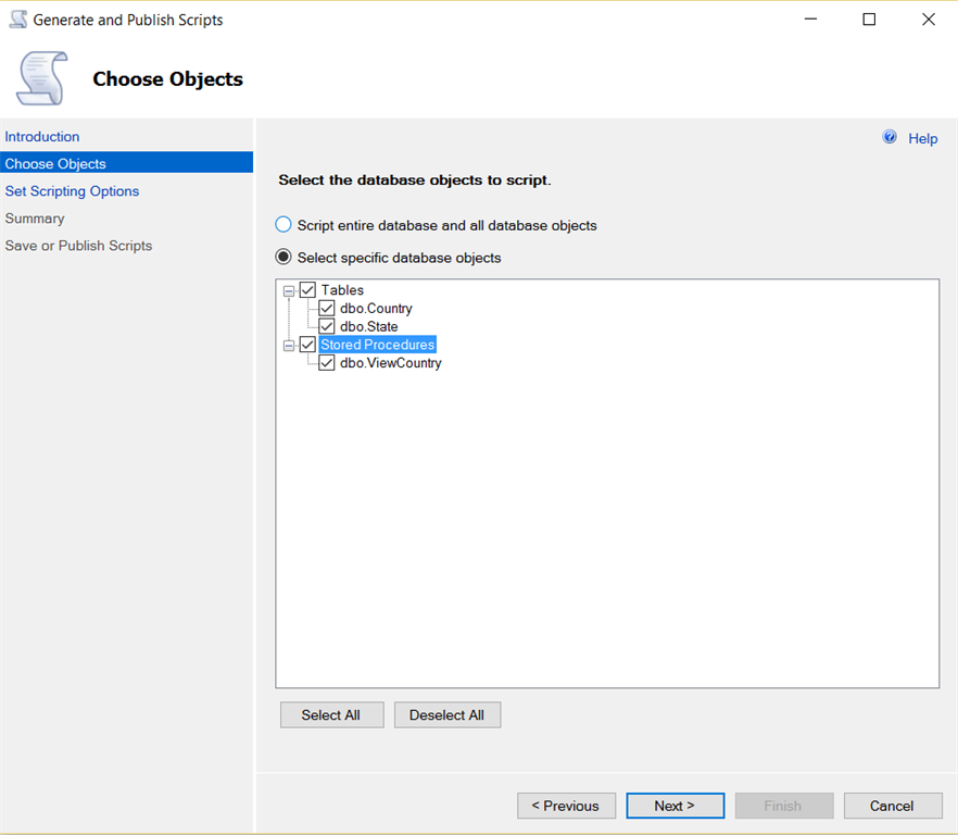 Choose Objects; here either you can select all tables and stored procedures, etc. or you can select specific tables or stored procedures. Click on 'Next' button.