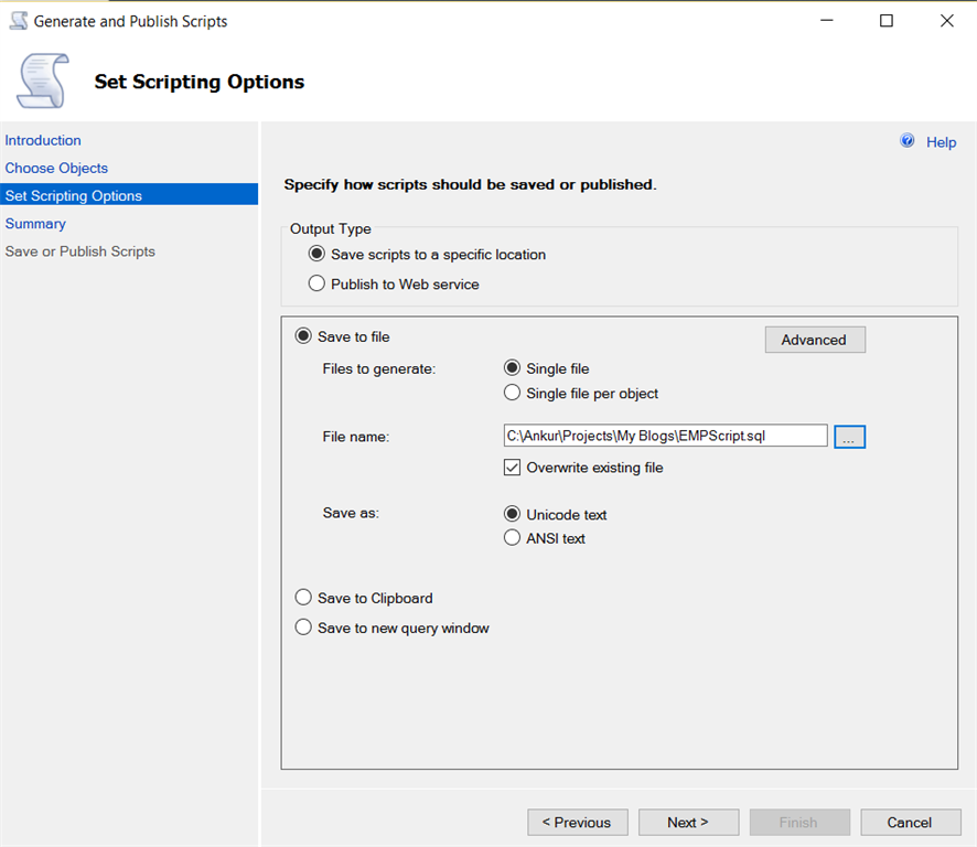 Set Scripting Options, You can select Output Type like "Save scripts to a specific location" or "Publish to web service," here we will select first option. Give a file name and location where you want to save the script.