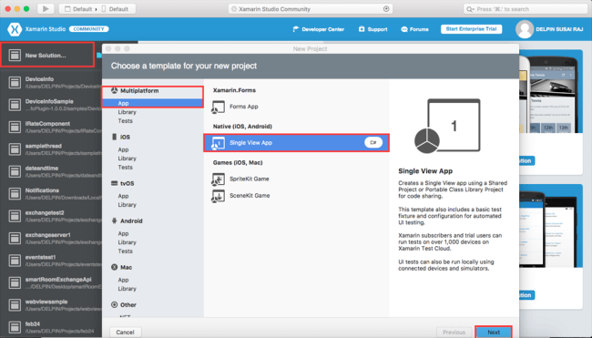Click New Solution—> select Multiplatform—>select App--> Choose single View App. Native (iOS,Android). Afterwards, click Next.