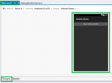 Step 3 Now, go to Solution Explorer. In Solution Explorer, get all the files and sources in your project. Subsequently, select Resource-->Layout-->double click to open main.axml page. To write XAML code, you need to select the source. Choose the Designer Window, if you want to design it, and you can design your app.