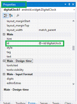 Step 7 Now, go to the properties Window. You need to edit the DigitalClock's Id value.