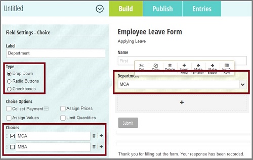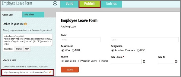 After designing, click on the Publish tab. There, copy the URL link and paste it into another tab to publish the form.