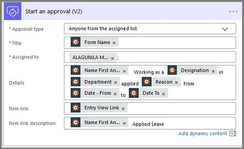 Choose the Approval type, Title, Assigned to (we give Email address of the person who gives approval to this Form), Details, Item Link, Item Link Description.