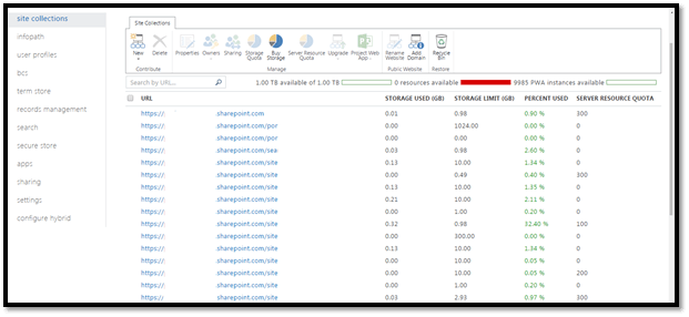 Once you click on SharePoint, the page navigates to admin page, where you can see the list site instances, as shown below.
