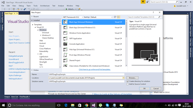 - In Visual Studio, create New Project as “Blank App (Universal Windows)”.