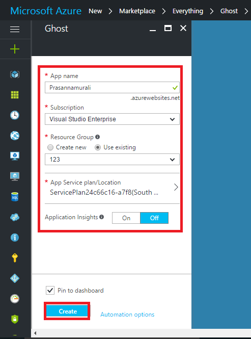 If you need Application Insights, then click Yes to activate the Application Insights option. Then, finally tick "Pin to dashboard" to pin your app to Azure Start page, for easy access.