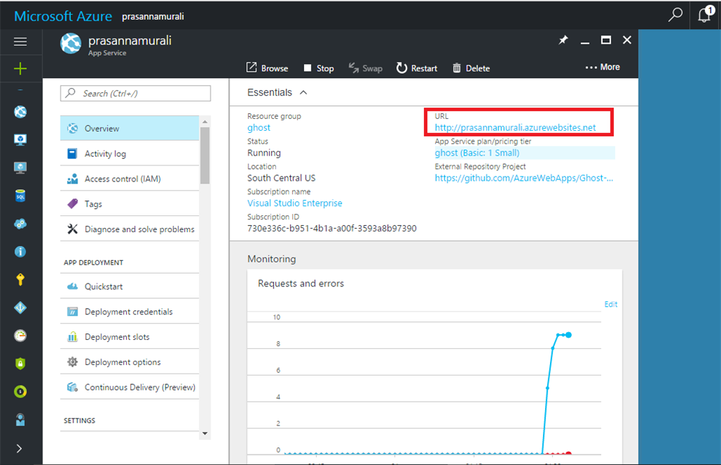 Congrats! Our Ghost web app is deployed successfully. Now, you will be navigated to the Settings page of your web app.