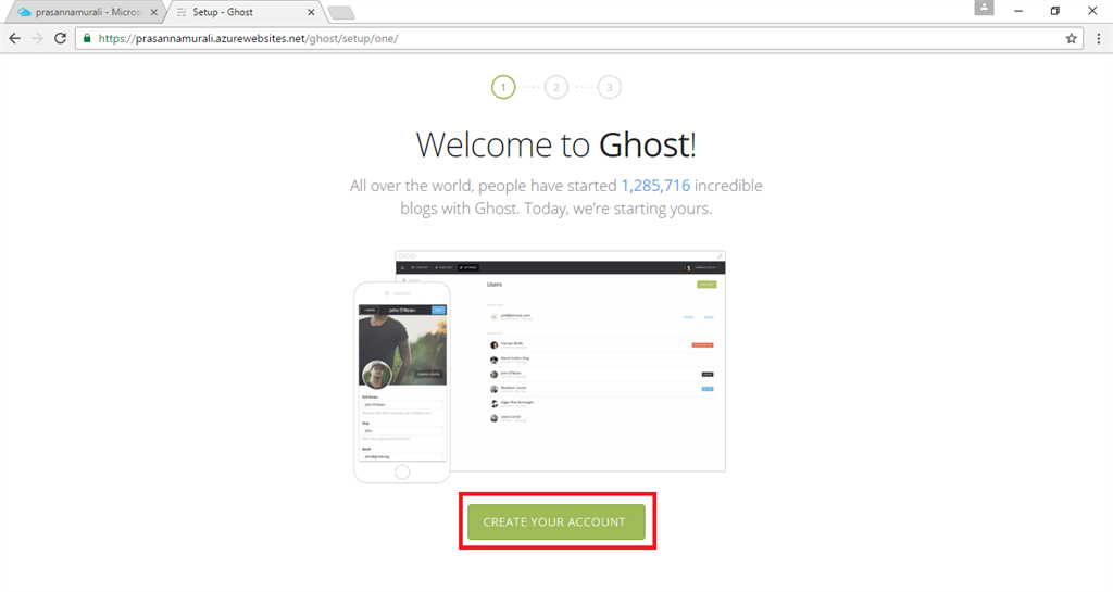 Now, our Ghost web app is working as expected. It’s time to setup administrator of our created Ghost Web app.