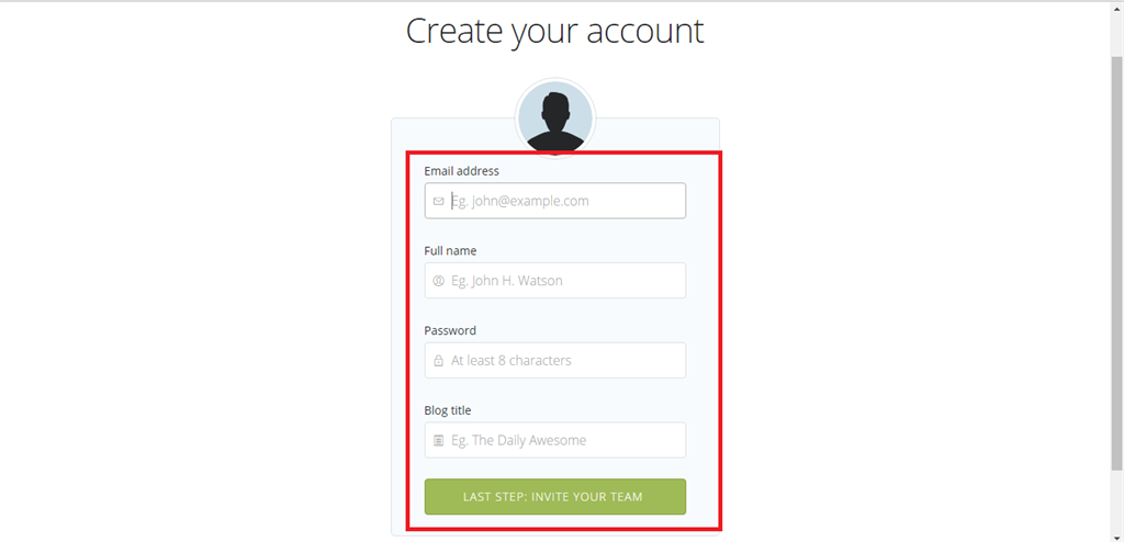 Provide your valid email ID, full name, blog name, and password. Then, click “Last step: Invite your team”.