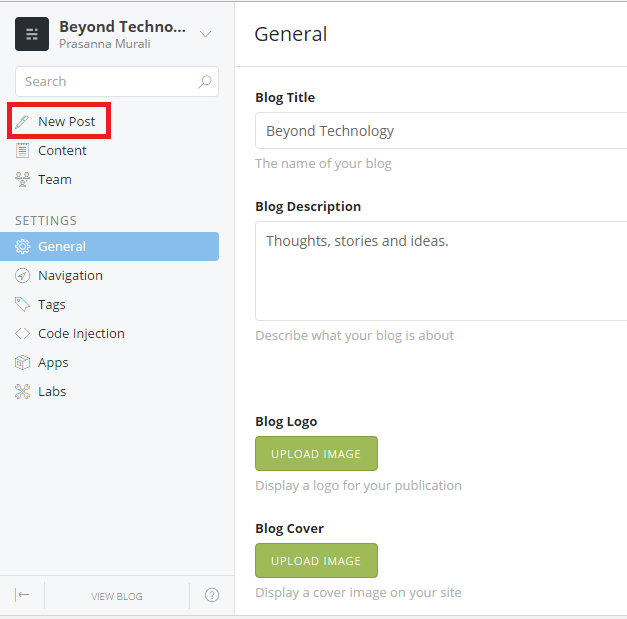 Now, on Admin page, click “New Post” to create a new post in Ghost Blogger.