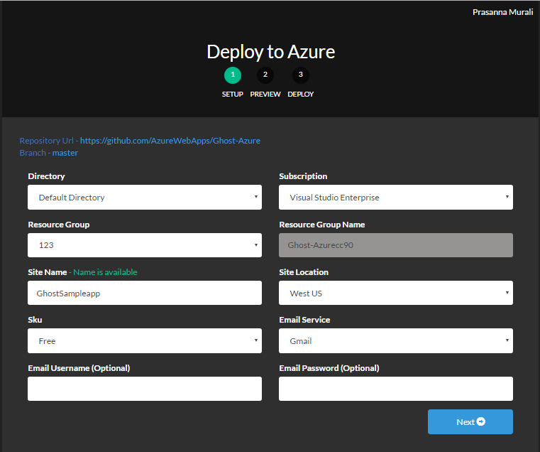 It will automatically open up Ghost-Azure project in GitHub. Scroll down and find “Readme.md” file. Click “Deploy to Azure” and this will automatically start provisioning Ghost for you in Microsoft Azure.
