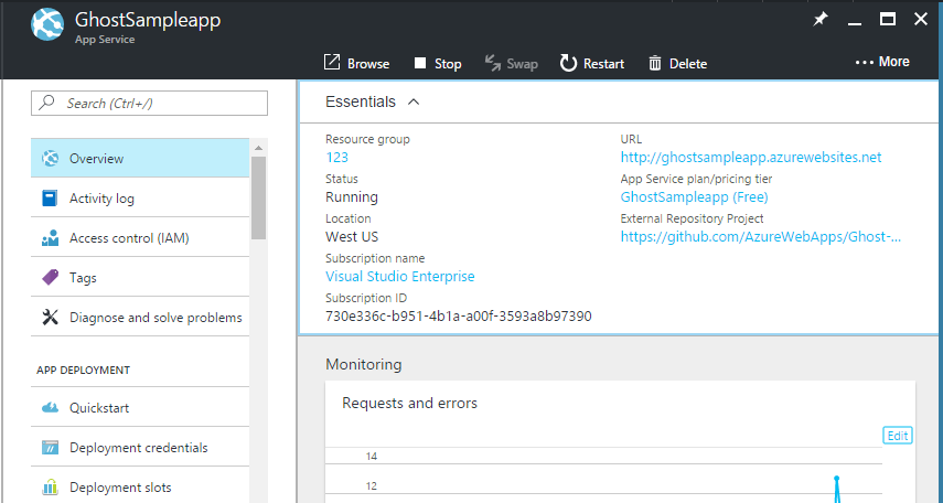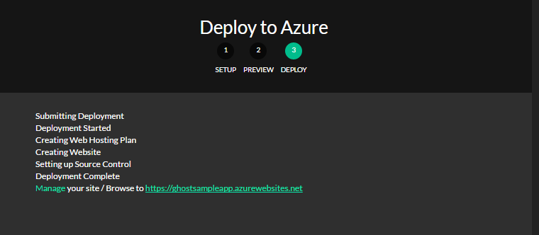 Congrats. Our Ghost Web app is deployed successfully. Now, you will be navigated to the Settings page of your Web app.