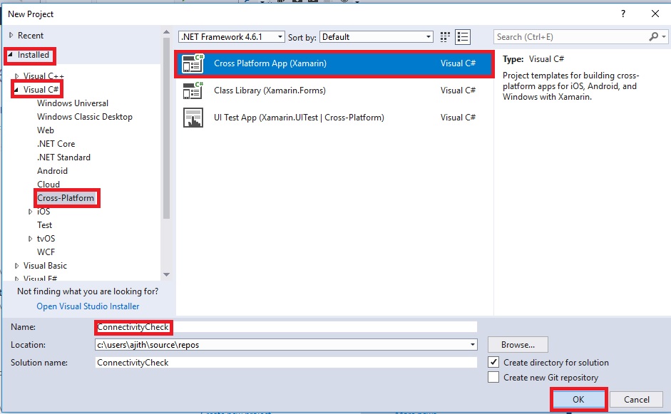 Open Visual Studio and go to New Project >> Installed >> Visual C# >> Cross-Platform.