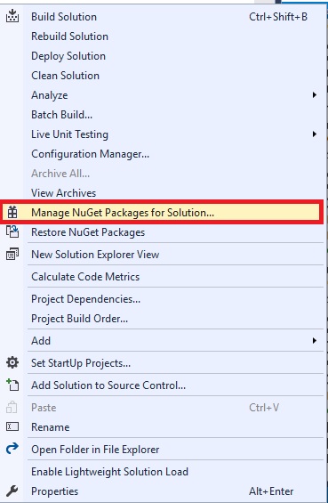 Go to Solution Explorer and select your solution. Right-click and select "Manage NuGet Packages for Solution".