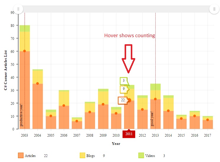 If you move cursor on any part of a bar then you can see the counting of articles, blogs, aand videos like this.