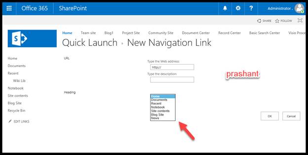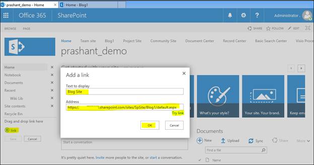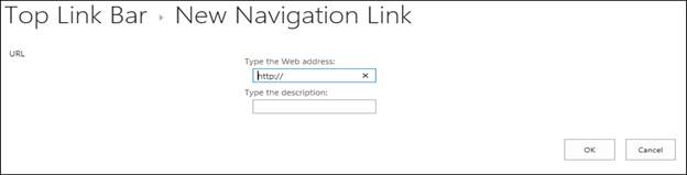 - Click OK to add the new link to the Quick Launch or Top link bar.