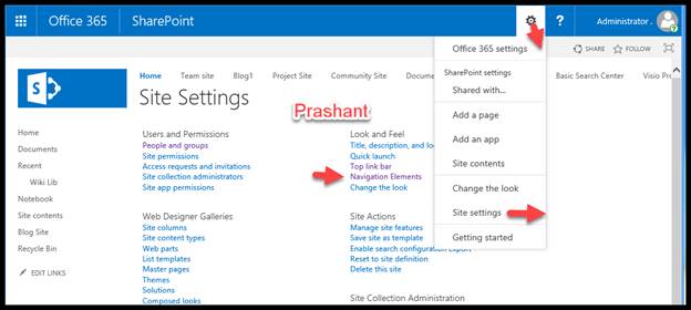 - To check out Navigation site page, click on Site Setting page from Settings gear and select Navigation elements from Look and Feel categories, refer to the below screenshot.