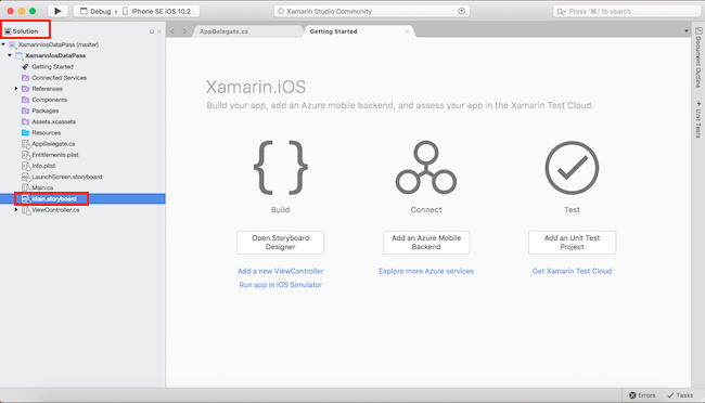 Subsequently, go to Solution. In Solution, get all the files and sources in your project. Now, select Main.storyboard and double click to open Main.storyboard page.