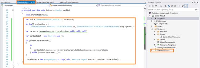 Xamarin is a platform to develop the cross-platform and multi-platform apps. (Ex. Windows phone, Android, iOS). In the Xamarin platform, the code sharing concept is used. In Xamarin studio, Visual Studio is also available. Viewing the contacts from your Android phone is possible, using this Xamarin Android app.