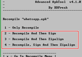 For that, you have to open Apktool again and choose "3 – Recompile Files", choose your apk, and choose Recompile and then Signed. Press Enter finally. Your apk will be recompiled and the new apk will be located at 4-Done folder.