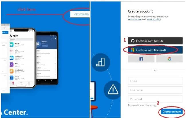 Click on Get started then you will see Create account page. If you already have a Microsoft account then click on 1, otherwise register yourself and click on 2.