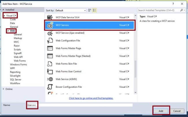- Add new WCF Service. Right click on WCFService (project) > Add > New Item. Then, select WCF Service on "Add New" dialog box and name it "User.SVC".