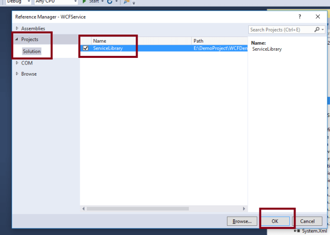 Now, the Reference of "ServiceLibrary" project is added to "WCFService" project.