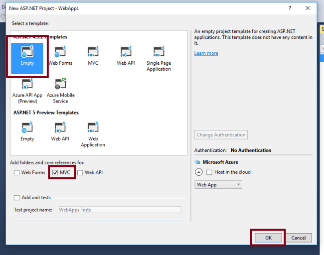 - Now, in the dialog box, click on the "Empty" under the ASP.NET 4.5.2 Templates. Then, check on "MVC" checkbox and click OK.