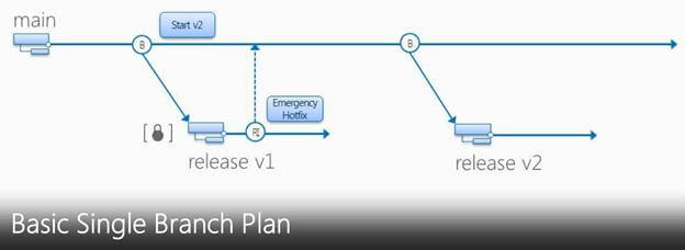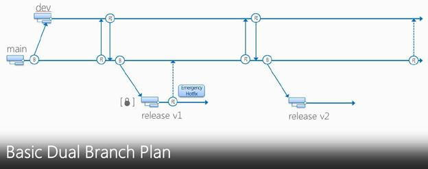 Basic Dual Branch is an Ideal branch plan, have a Main, spin a Dev branch for development and have RI (Reverse Integration) and FI (Forward Integration) to merge changes between Child and Parent branch respectively.