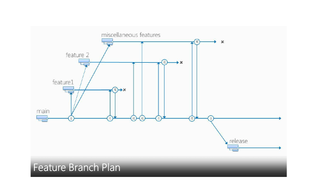 Feature Branch Plan is slightly complex and requires more merge efforts but at the same time it give entire isolation of work being done in a feature branch for entire time; until it’s ready for merge to Dev branch. One major issue with this plan is that your feature branch will have old and stale code and when you will Get Latest / Pull from the changes then you will get some conflicts etc.![]()