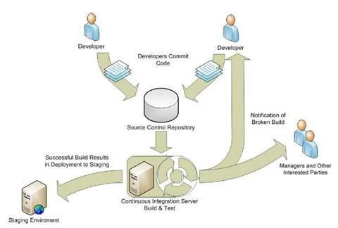 CI mainly focuses on development teams. The output of the CI system normally forms the input to the manual testing process and to the rest of the release process.