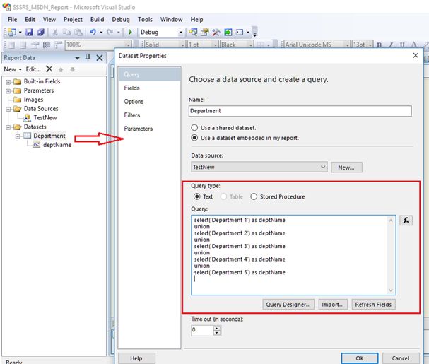 Create one new SSRS report with one data source and one data set, named as Department with Script, given below: