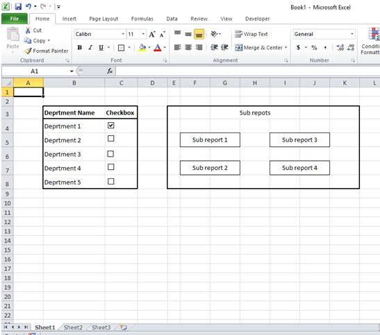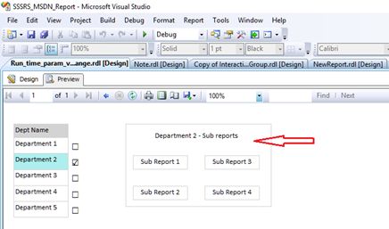 The client requirement is to create a SSRS report with the list of departments and check box for the departments and static section of the list of the sub reports, which will drill through to respective sub reports.