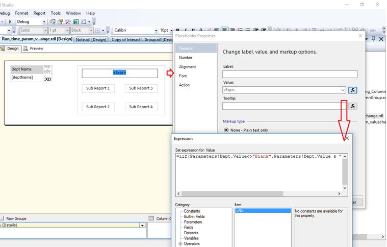 - =iif(Parameters!Dept.Value<>"Blank",Parameters!Dept.Value &" - ","") &"Sub reports"