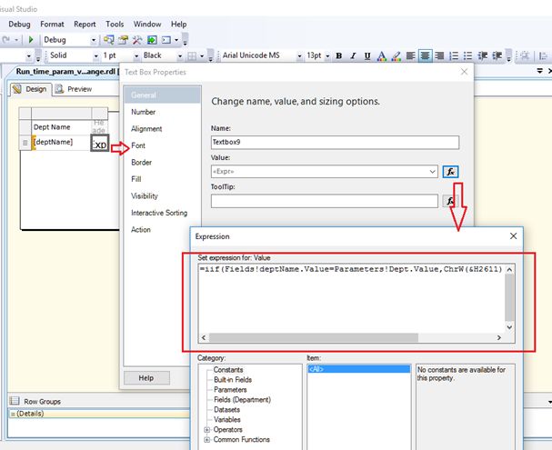 - =iif(Fields!deptName.Value=Parameters!Dept.Value,ChrW(&H2611),ChrW(&H2610))