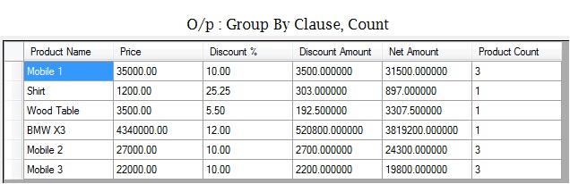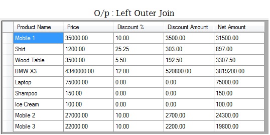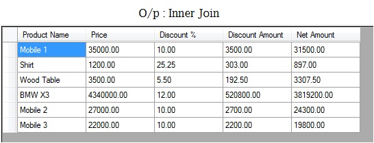 The exmaple shows a simple Innner join query. This query shows the list of product names, amount, discount, net amount - those who having matching elements with discount pairs. If product does not have any discount id, then this will not display.