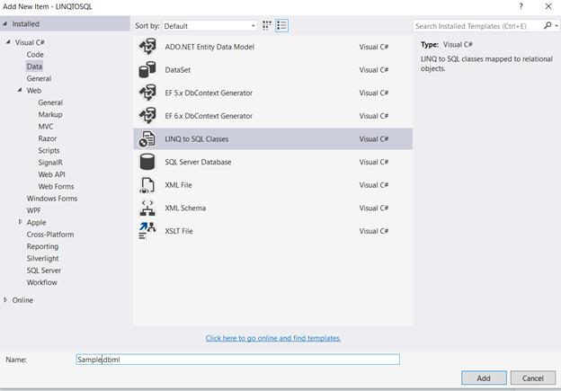 Now, we have data in both the tables. Now, create an empty web application. Add a "New item" and select Data -> LINQ to SQL Classes -> Name it Sample.dbml.