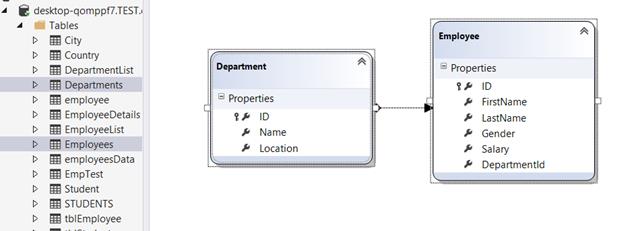 Notice that it is automatically going to create the entities for those two tables. These entities are mapped to their respective tables. Also, notice that there is an association between department and employee table. This association is modeled based on the primary key and foreign key relationship. In employee table, departmentID is the foreign key.