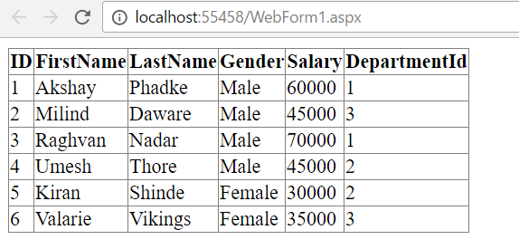So, we have created the instance of SampleDatacontext and in the GridView Control, we are passing Employees and displaying all the table details. Now, run the form.