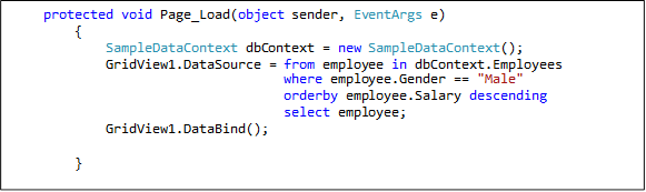 So, we got only male employees and they are sorted by salary in descending order. Now, the interesting thing is that we have not returned any T-SQL query but all we have returned is LINQ query. So, how is the application is getting all the data from SQL Server? If you refer to my previous article on LINQ, we have seen LINQ to SQL providers. In there, we learned how the application issues this query to the provider and then it generates a T-SQL query. Then, the SQL Server executes the query and then returns the matching rows.