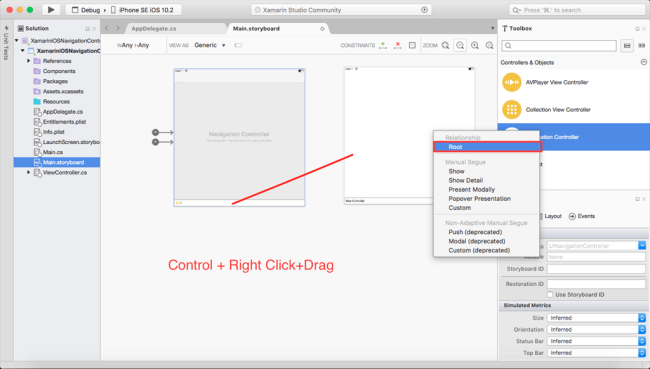In this step, set the Root of your view controller. You can click the bottom of navigation controller (Ctrl+right click+ drag) move the cursor to View Controller. If it is released, the click shows the list of options. You can choose Root.