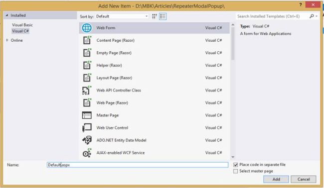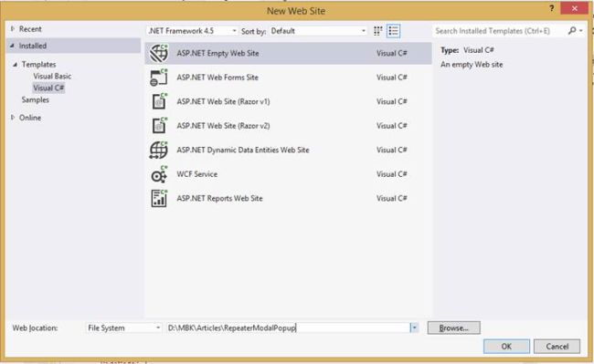 Create an ASP.NET Empty Web Site project, named as “RepeaterModalPopup”.