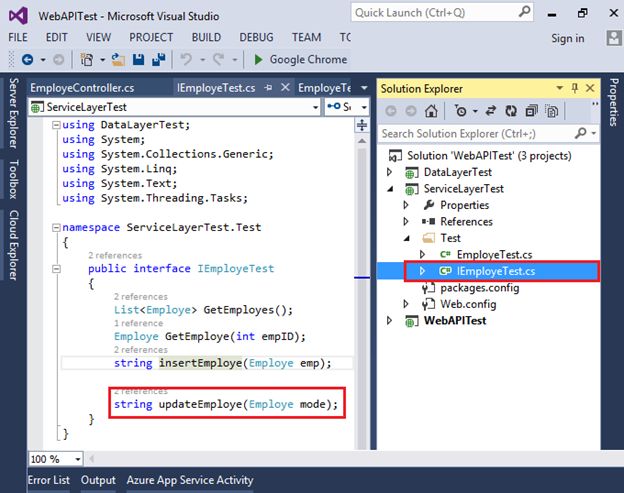 Under the IEmployeTest Interface, create a method to update a record of the employee, followed by the table name, i.e., Employee.