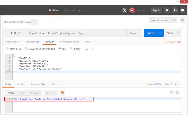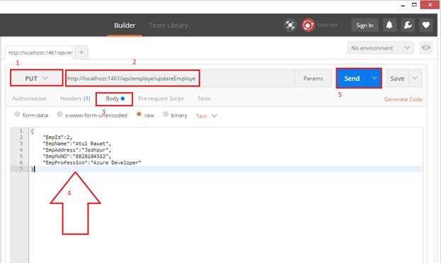 Similarly to previous articles, I’m using here Postman for the PUT request. Open Postman and call the PUT method. Enter your Web API URL and make sure your Visual Studio project is in running mode. For this request, I need to call updateEmploye method in the URL. Under the body, you have to write the JSON script of your data which you want to update. Finally, click the send button to make a request.