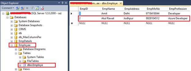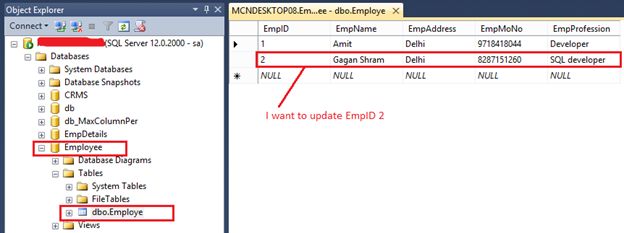 Now, all the code is set into the Visual Studio. Flip to your SQL Server Management. I have two records in the Employee table. Let’s suppose I want to update the second row that holds EmpID 2.